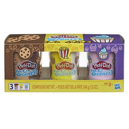 GET A WHIFF OF THIS - With 3 fun scented Play-Doh smells in each pack and 4 ounces in each can, kids 3 years and up can make colorful Play-Doh creations that are fun to look at and smell good, too! SILLY SNACK-TASTIC SMELLS - squishy Play-Doh compound that smells like popcorn, cookies, and cupcakes. Each scent has double colors in each can! THE PLAY-DOH FUN FAMILIES LOVE - This Play-Doh Scents 3-pack comes from the makers of Play-Doh modeling compound, a trusted arts and crafts brand for over 60 years. A SCENT-SATIONAL TOY FOR KIDS 3 AND UP - This scent-sational experience makes a fun kids birthday party favor, holiday stocking stuffer, or add-on to any Play-Doh playset (sold separately). Make eyes, hands, and noses happy with Play-Doh creations that smell like kids' favorite snacks! This scented Play-Doh 3-pack brings a scent-sational multisensory experience with 2 colors in each can, soft Play-Doh texture, and 3 delightfully fun scents. Cookie, cupcake, and popcorn scents each come in their own 4-ounce cans to make your Play-Doh creations smell super snack-tastic. This scent-sational arts and crafts toy for kids 3 years and up comes from the makers of Play-Doh modeling compound, a trusted arts and crafts brand for over 60 years, and makes a great birthday party favor, stocking stuffer, or add-on to any Play-Doh playset (sold separately). Hasbro, Play-Doh, and all related properties are trademarks of Hasbro. Includes 3 cans of Play-Doh Scents scented modeling compound and plastic knife. Ages 3 years and up Product and colors will vary. Compound not intended to be eaten. Notice to Parents: Contains Wheat. Non-Toxic. Conforms to: ASTM D-4236. To clean, allow to dry, then scrape or vacuum. Molded results vary depending on child's age and level of skill.