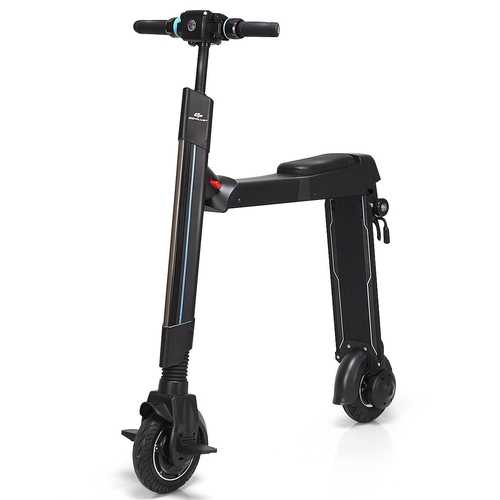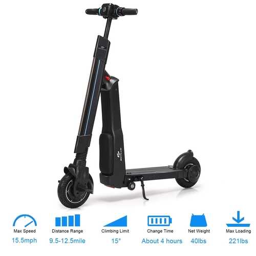 Two ways to ride it standing or sitting Powered with 250 W motor control on the front and rear wheels 5.2 Ah 36 V lithium battery supports 12.5 mile ridding Smart lithium battery charger has fast charging (4-6 hours) The speed can reach to 15.5 mph maximum stroke 10.5-12.5 Miles Long rolling over Inclines as steep as 15 degrees Spring shock absorption and 8" pneumatic tires provide great shock absorption and anti-slip function Can be folded down quickly with ultra-convenient one-second folding mechanism A brake button and rear wheel fender braking system to stop securely Equipped with a bright headlight and decorative lights ensuring you ride safely in the dark LED display interface shows speed and 5 levels power Features music play and Bluetooth play function Suitable for ages 13 years old and above weight capacity of up to 221 lbs