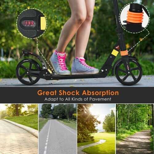 It gives you great riding experience without much vibration by its shock absorption system. 8" large PU wheels can ride on all kinds of ground. Wide deck with anti-skid surface ensures your safety. The rear fender is also a brake to stop the scooter. And with a kickstand it can stand steadily. When not in use it can be folded for place saving and easy carrying.