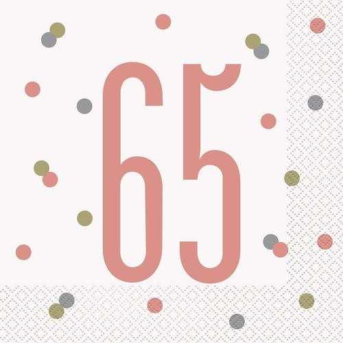 16 Rose Gold Glitz 65th birthday party Napkins 2-Ply paper napkins measure 6.5" X 6.5" Disposable napkins make after-party cleanup easy Excellent for a 65th birthday party Combine with more Rose Gold Glitz 65th birthday party supplies from Unique