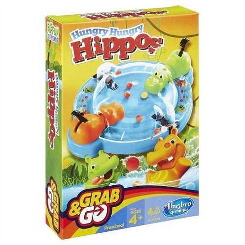 Chomp, chomp - you've got some hungry hippos on your hands! This Grab & Go version of the classic Hungry Hungry Hippos game has 2 chomping hippos and a whole bunch of marbles for munching. With a plastic cover to keep the marbles from rolling out, this compact game lets you have hippo-feeding fun anytime, anywhere!