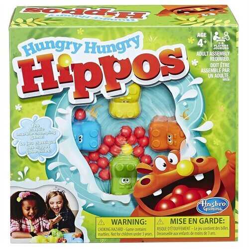 You'll have a chompin' good time with Hungry Hippo and his pals! Be ready to join in the feeding frenzy when you release all the marbles onto the game base, because all the hippos will be chomping and your hippo will need to move fast! If he chomps the golden marble, you win! Classic HUNGRY HUNGRY HIPPOS game has 4 hippo heads and bodies plus marbles for them to chomp! 20 marbles! One golden marble! Cleanup is a snap with the marble and hippo storage! Game base comes with 4 hippo heads, 4 hippo bodies, 4 marble launchers and guides, 20 plastic marbles, label sheet and instructions. • 2-4 players. • Ages 4 and up.